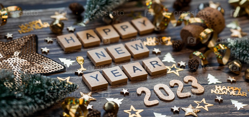 Баннер. Символ числа 2023 с золотыми шарами, звездами, блестками и елкой на деревянном фоне. Концепция празднования Нового 2023 года и Рождества