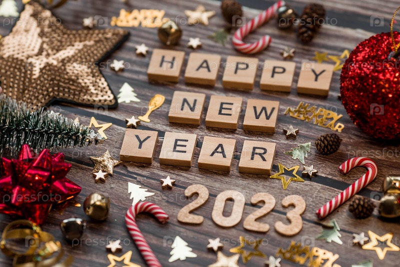 Баннер. Символ числа 2023 с золотыми и красными шарами, звездами, блестками и елкой на деревянном фоне. Концепция празднования Нового 2023 года и Рождества