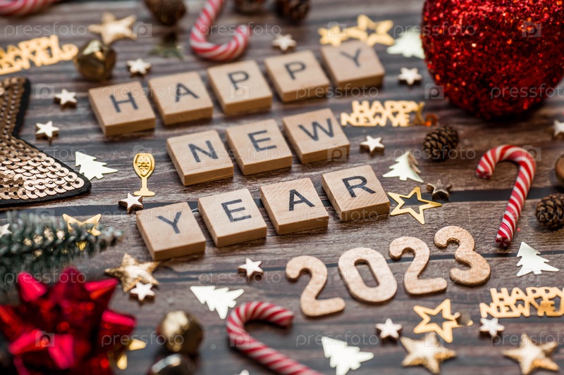 Баннер. Символ числа 2023 с золотыми и красными шарами, звездами, блестками и елкой на деревянном фоне. Концепция празднования Нового 2023 года и Рождества