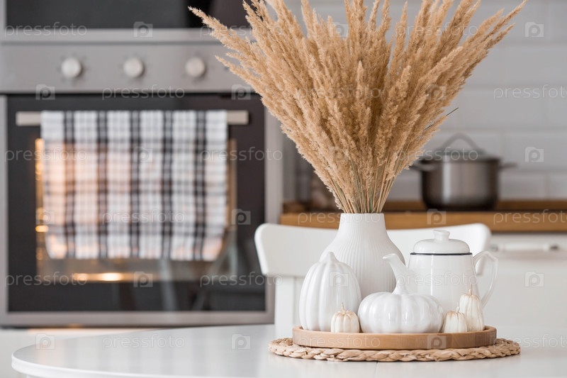 Натюрморт. Сушеная пампасная трава в вазе, белые керамические тыквы, чайник и свечи в форме тыквы на белом столе в интерьере домашней кухни в скандинавском стиле. Уютная осенняя концепция