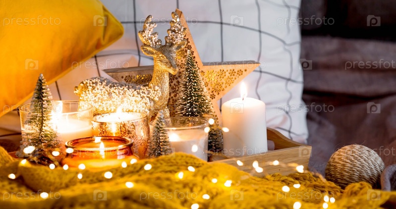 Зажженные свечи и рождественские украшения на деревянном подносе с теплым пледом. Зимний уютный стиль. Концепция хюгге