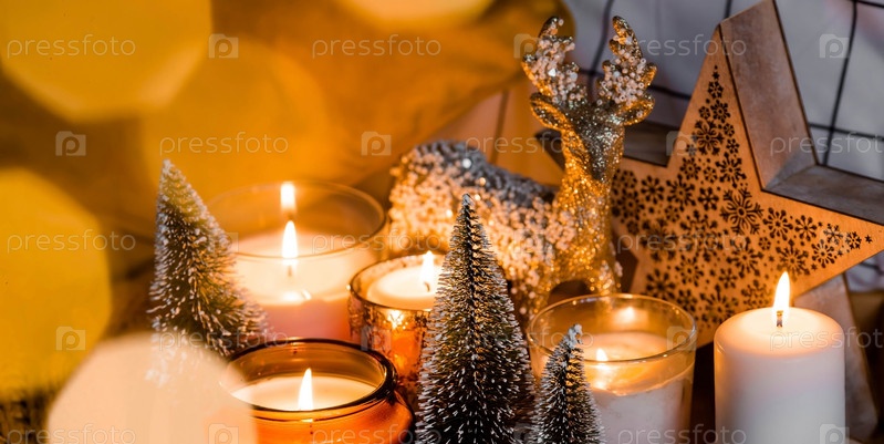 Зажженные свечи и рождественские украшения на деревянном подносе с теплым пледом. Зимний уютный стиль. Концепция хюгге