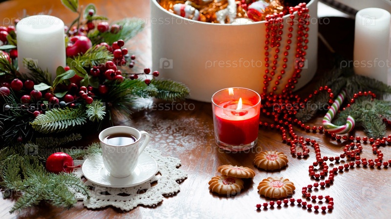 Баннер. Рождественское утро 2023 года в традиционных красных тонах. Новогодние игрушки, кофе и красивые украшения на деревянном столе
