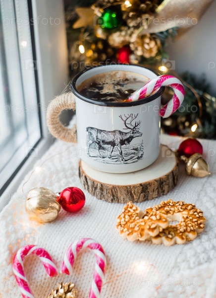 Рождественское утро. Рождественские игрушки и чашка кофе на светлом фоне