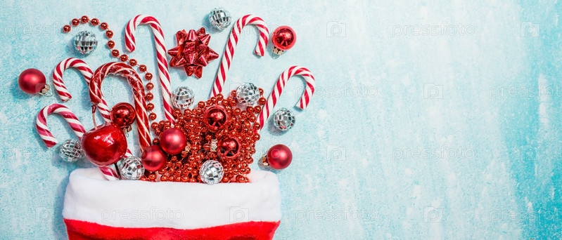 Рождественская шапка Санта-Клауса с рождественскими конфетами, игрушками и блестками на синем фоне. Минимальная рождественская концепция. Карамельная трость. Копия текстового пространства