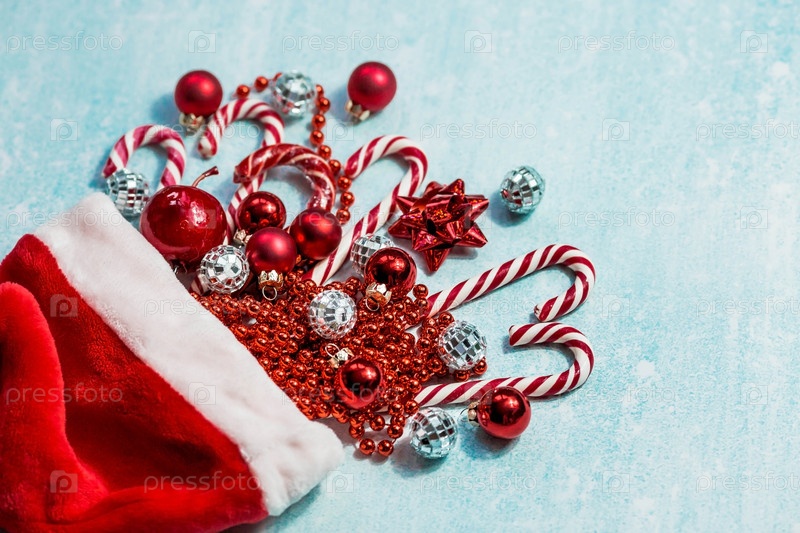 Рождественская шапка Санта-Клауса с рождественскими конфетами, игрушками и блестками на синем фоне. Минимальная рождественская концепция. Карамельная трость. Копия текстового пространства