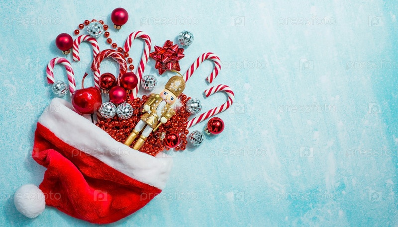 Рождественская шапка Санта-Клауса с рождественскими конфетами, игрушками и блестками на синем фоне. Минимальная рождественская концепция. Карамельная трость. Копия текстового пространства