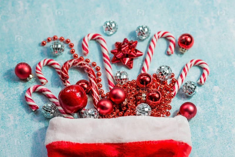 Рождественская шапка Санта-Клауса с рождественскими конфетами, игрушками и блестками на синем фоне. Минимальная рождественская концепция. Карамельная трость. Копия текстового пространства
