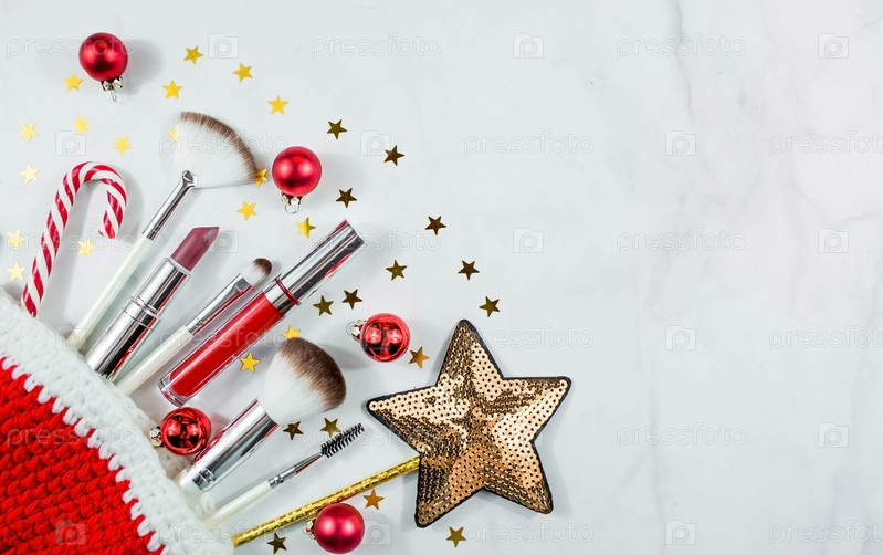 Баннер. Плоская композиция с декоративной косметикой и шляпой Санты на светлом фоне. Зимний уход. Понятие красоты и моды