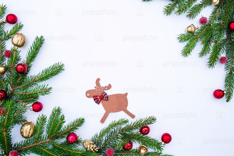 Новогодний фон с елкой и красными игрушками на белом фоне. Счастливая рождественская открытка. Тема зимнего отдыха. С Новым Годом. Место для текста