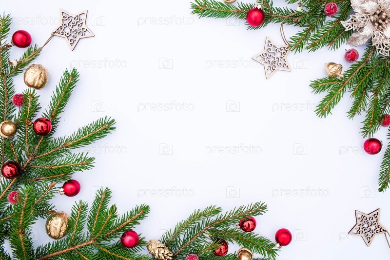 Новогодний фон с елкой и красными игрушками на белом фоне. Счастливая рождественская открытка. Тема зимнего отдыха. С Новым Годом. Место для текста