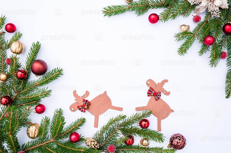 Новогодний фон с елкой и красными игрушками на белом фоне. Счастливая рождественская открытка. Тема зимнего отдыха. С Новым Годом. Место для текста
