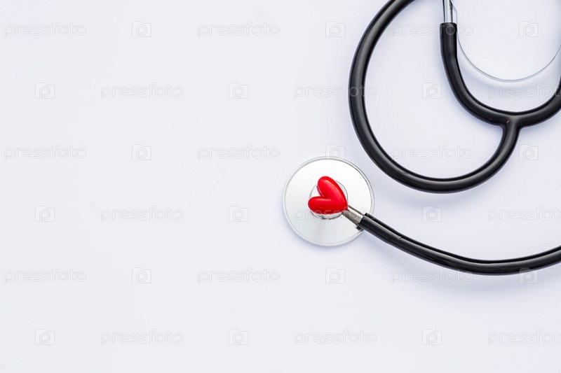 Креативный медицинский стетоскоп открытки, таблетки и красное сердце на белом фоне. Плоская медицина