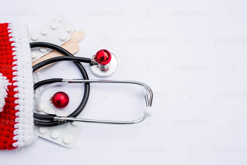 Медицинский баннер 2023 года для клиник с таблетками, стетоскопом и рождественской елкой на белом фоне. Копипространство. Медицина новый год плоский