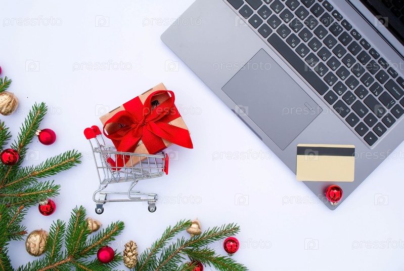 Баннер. Компьютер, подарочная корзина и кредитная карта. Рождественские интернет-магазины. Зимние праздничные распродажи, сезонные распродажи, Черная пятница, Рождество, скидки и покупки на месте