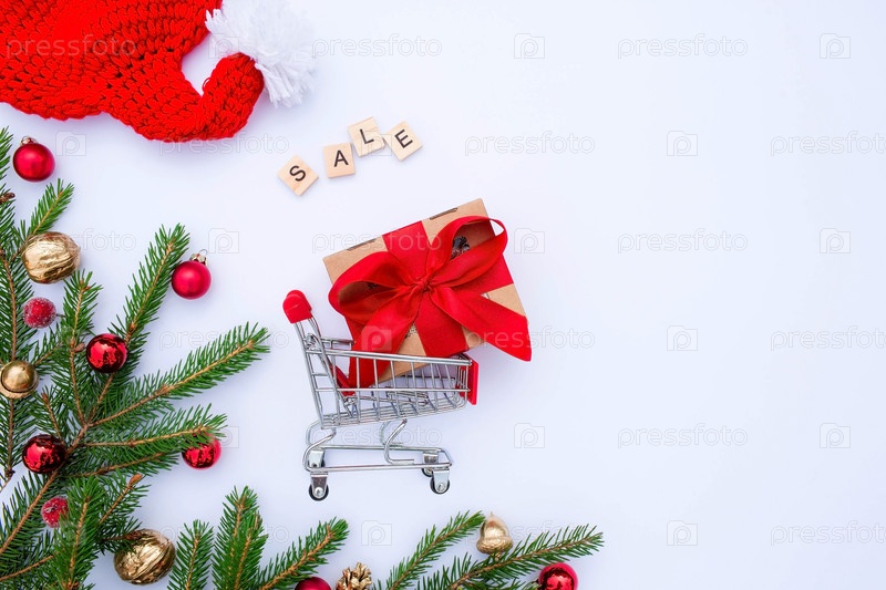 Продуктовая корзина, подарочная коробка и рождественская елка. Надпись на английском языке: «продажа». Рождественские интернет-магазины. Зимние праздничные распродажи, сезонные распродажи, Черная пятница, Рождество, скидки и покупки на месте