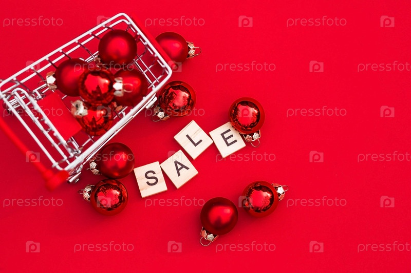 Продуктовая корзина с красными воздушными шарами и буквами. Надпись на английском языке: «распродажа». Рождественские интернет-магазины. Зимние праздничные распродажи, сезонные распродажи, Черная пятница, Рождество, скидки и покупки на месте