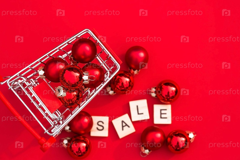 Продуктовая корзина с красными воздушными шарами и буквами. Надпись на английском языке: «распродажа». Рождественские интернет-магазины. Зимние праздничные распродажи, сезонные распродажи, Черная пятница, Рождество, скидки и покупки на месте