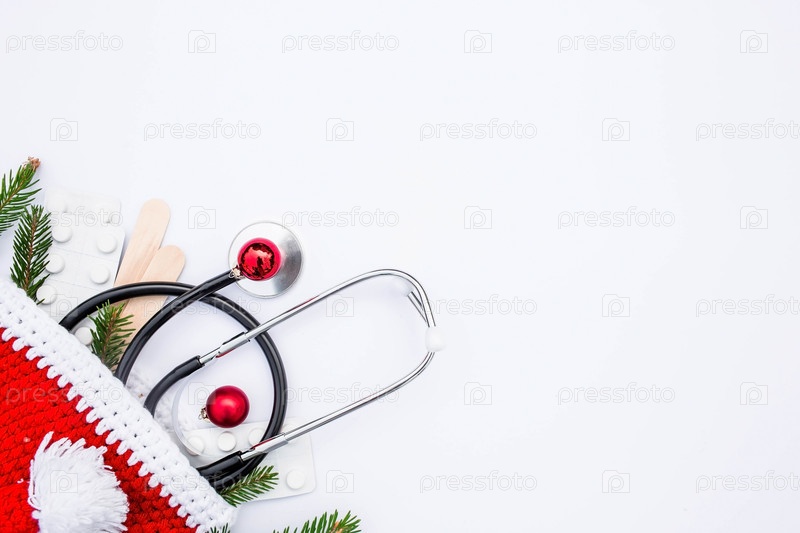 Медицинский баннер 2023 года для клиник с таблетками, стетоскопом и рождественской елкой на белом фоне. Копипространство. Медицина новый год плоский