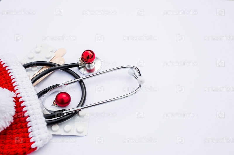 Медицинский баннер 2023 года для клиник с таблетками, стетоскопом и рождественской елкой на белом фоне. Копипространство. Медицина новый год плоский