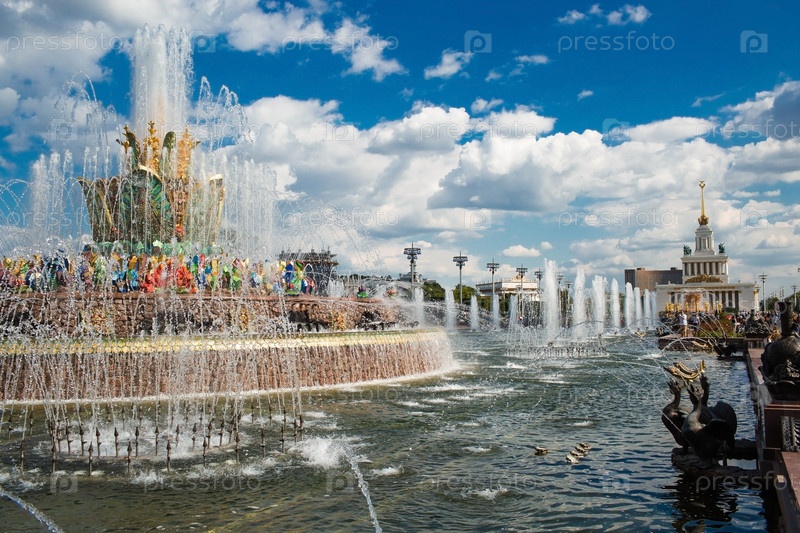 МОСКВА, РОССИЯ. Фонтан Каменный цветок и Павильон Украины на фоне голубого неба и облаков панорамный вид, летний солнечный день, Выставка достижений народного хозяйства ВДНХ
