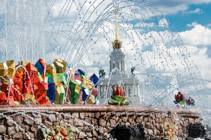 МОСКВА, РОССИЯ. Фонтан Каменный цветок и Павильон Украины на фоне голубого неба и облаков панорамный вид, летний солнечный день, Выставка достижений народного хозяйства ВДНХ