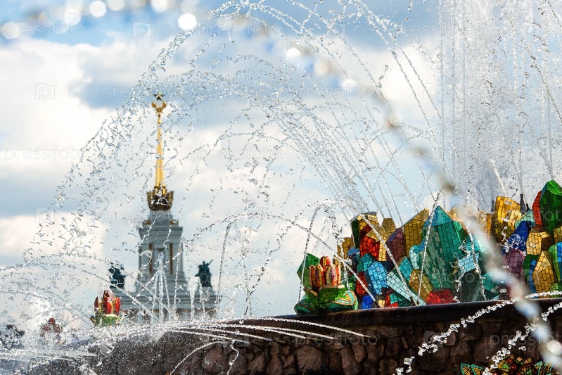 МОСКВА, РОССИЯ. Фонтан Каменный цветок и Павильон Украины на фоне голубого неба и облаков панорамный вид, летний солнечный день, Выставка достижений народного хозяйства ВДНХ