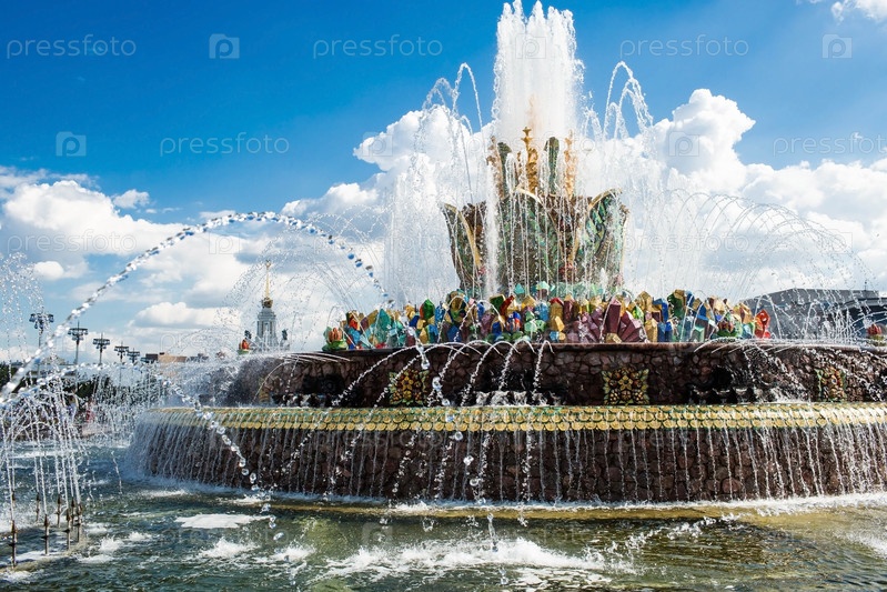 МОСКВА, РОССИЯ. Фонтан Каменный цветок и Павильон Украины на фоне голубого неба и облаков панорамный вид, летний солнечный день, Выставка достижений народного хозяйства ВДНХ