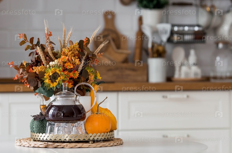 Натюрморт. Желтые, оранжевые цветы в вазе, тыквы и чайник на золотом подносе на белом столе в интерьере домашней кухни в скандинавском стиле. Уютная осенняя концепция