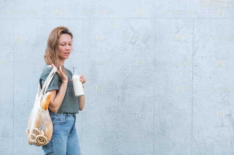 Современная стильная женщина со стеклянной бутылкой молока и авоськой покупает хлеб у серой стены. Концепция здорового питания и экологии. Отказ от пластиковых пакетов