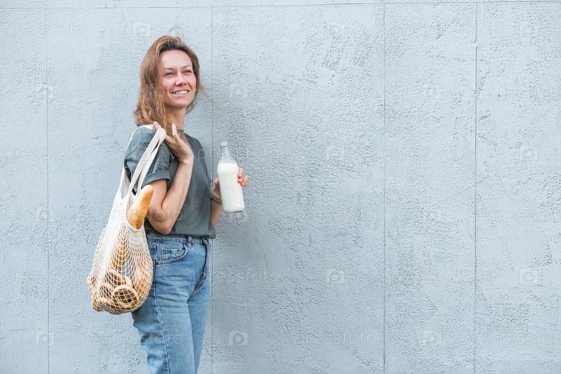 Современная стильная женщина со стеклянной бутылкой молока и авоськой покупает хлеб у серой стены. Концепция здорового питания и экологии. Отказ от пластиковых пакетов