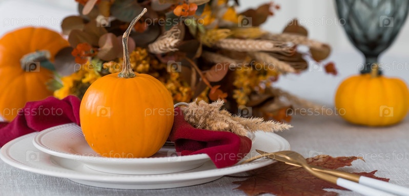 Красивая осенняя сервировка стола. Тарелка с хлопчатобумажной салфеткой и тыквой. Столовое золото и ваза с осенними цветами на льняной скатерти. Концепция праздничной сервировки на День Благодарения