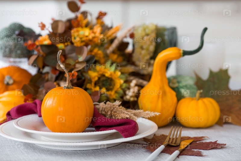 Красивая осенняя сервировка стола. Тарелка с хлопчатобумажной салфеткой и тыквой. Столовое золото и ваза с осенними цветами на льняной скатерти. Концепция праздничной сервировки на День Благодарения