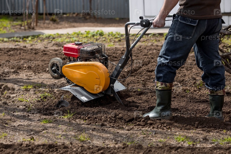 Баннер. Мужчина-фермер вспахивает землю культиватором. Сельскохозяйственная техника для обработки почвы в саду, комбайн