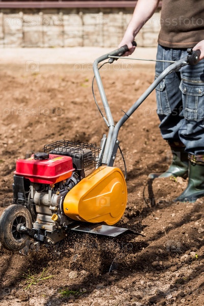 Баннер. Мужчина-фермер вспахивает землю культиватором. Сельскохозяйственная техника для обработки почвы в саду, комбайн