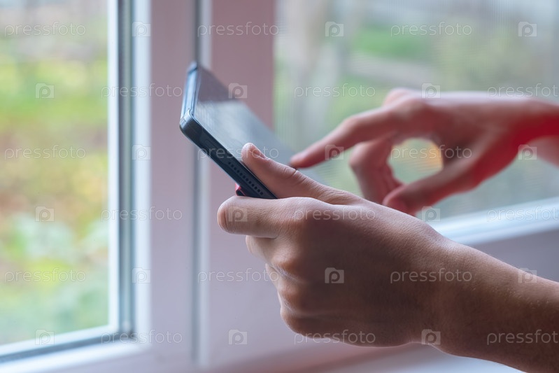 Руки человека держат планшет у окна
