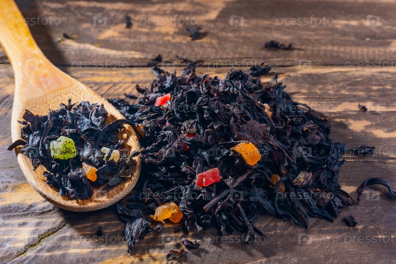 Черный чай с ломтиками сухофруктов на деревянном столе и деревянной ложкой