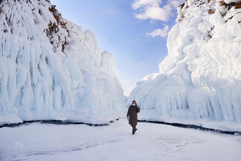 Огромные сосульки на скалах. Красивый зимний пейзаж