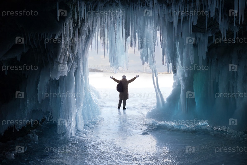 Вид из ледяной пещеры или грота с огромными голубыми сосульками