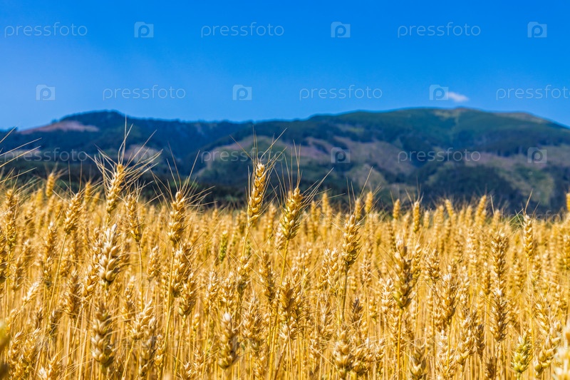 Золотое пшеничное поле на фоне гор. Созревание колосьев поля луговой пшеницы