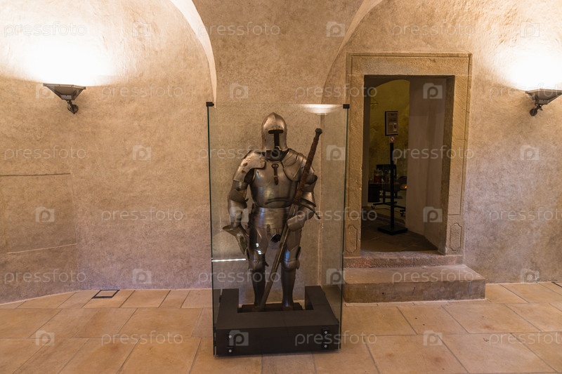 Рыцарские доспехи эпохи Возрождения в Оравском замке. Оравски Подзамок, Словакия, 21 июля 2022 г
