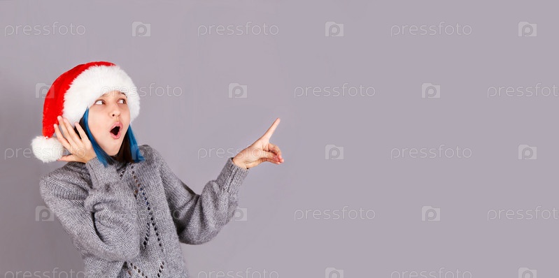Веселая, изумленная девушка в красной шляпе Санта-Клауса указывает пальцем на рекламу, пустое место