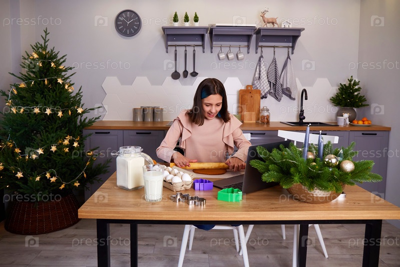 Счастливая девушка раскатывает тесто скалкой для приготовления рождественских пряников дома на кухне