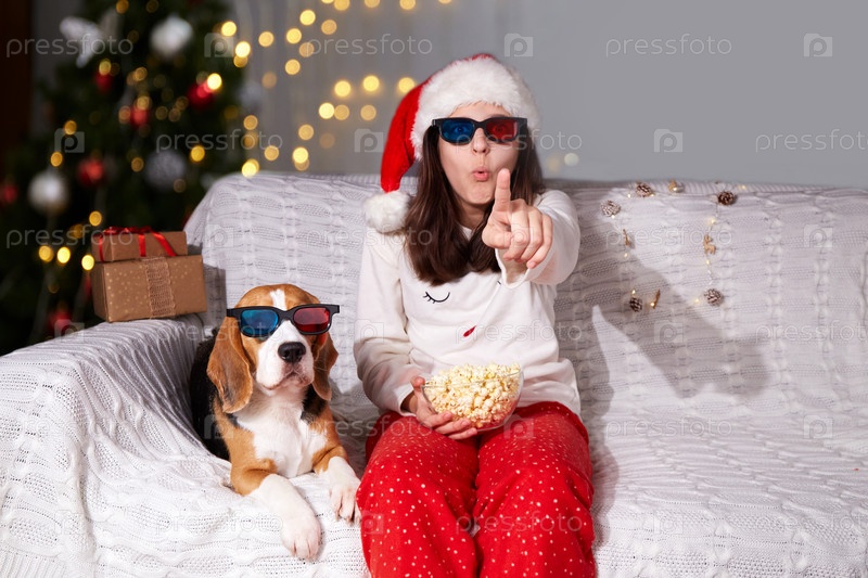 Девушка в шляпе Санта-Клауса и 3D очках сидит на диване