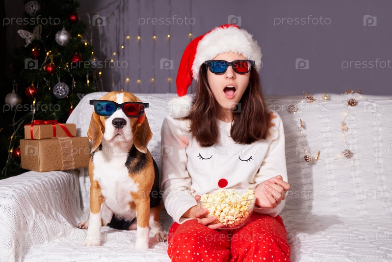 Девушка в шляпе Санта-Клауса и 3D очках сидит на диване