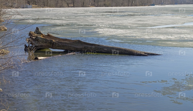 Таяние льда на озере весной. Мертвое дерево в воде. Апрель, ближнее Подмосковье, Бисеровское озеро