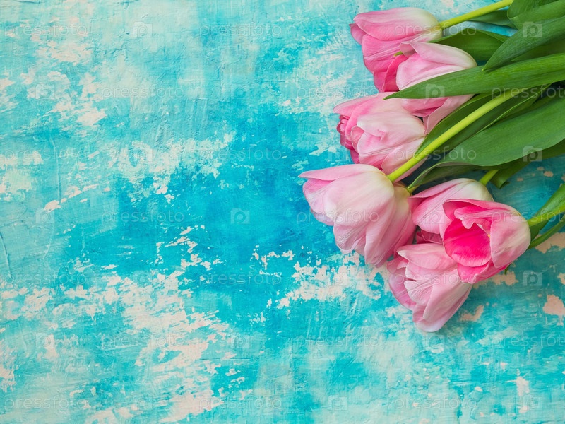 Праздничный фон с букетом розовых тюльпанов на синем фоне, пространство для копирования. Фон для открыток, приглашений и поздравлений