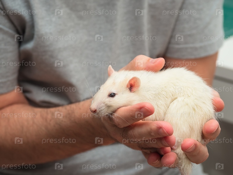 Неузнаваемый мужчина в серой футболке держит в руках большую белую крысу