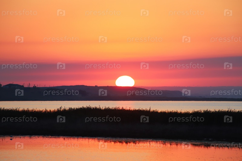 Большое солнце поднимается над заливом и холмами летним утром. Красивый пейзаж восхода солнца. Фон природы