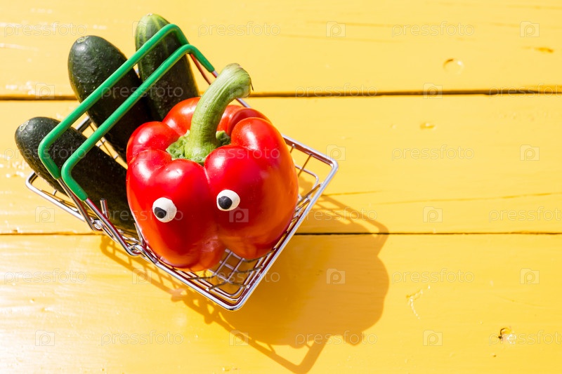 Забавная красная паприка с глазами и зелеными огурцами в маленькой корзине супермаркета на желтом фоне. Вегетарианская концепция, пространство для копирования